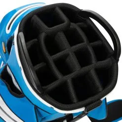 The NEW Cobra UltraDry Pro Cart Bag is a lightweight compact bag made with 100% polyester weighing 5.3 lbs and most importantly waterproof for them brave golf days in the harsh weathers. This bag fits most carts and doesn’t create any struggle to get in place and doesn’t have any pockets covered by straps making it stress free.